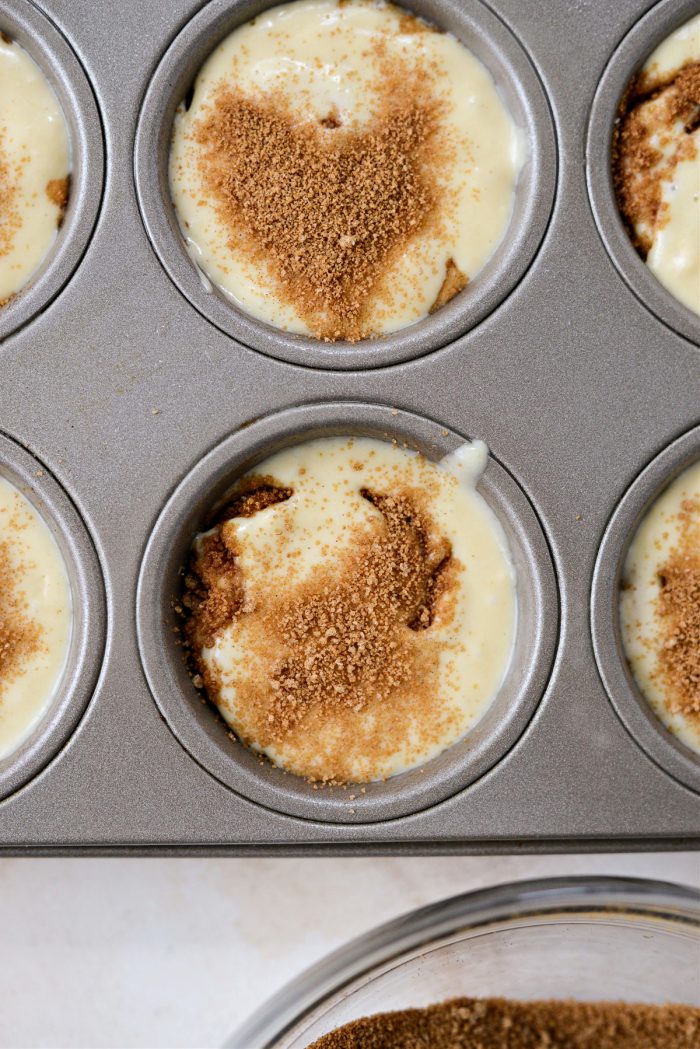 - Measure 2 tablespoons of the batter and add it into greased muffin cup. Sprinkle 1 teaspoon of the cinnamon brown sugar over top. Divide the remaining batter over top of each muffin (about 1½ tablespoons).