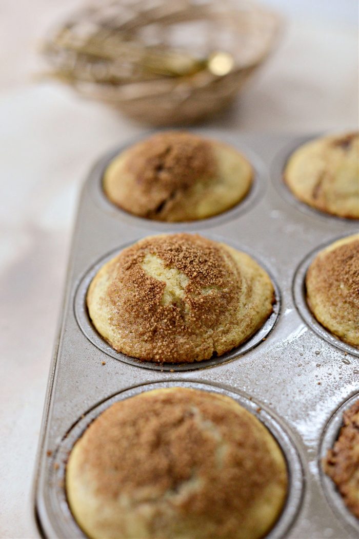 Lastly sprinkle with a little bit more of the cinnamon sugar. Slide the muffin tin onto the middle rack of your preheated 350° oven and bake for 12-14 minutes, rotating the pan half way.