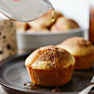 Tender, moist pancake muffins swirled with brown sugar and cinnamon – seriously, what’s not to love?  Our favorite part is the crisp sugary topping with the maple syrup drizzled over top. SO GOOD! Definitely a fun treat to bake on the weekend.