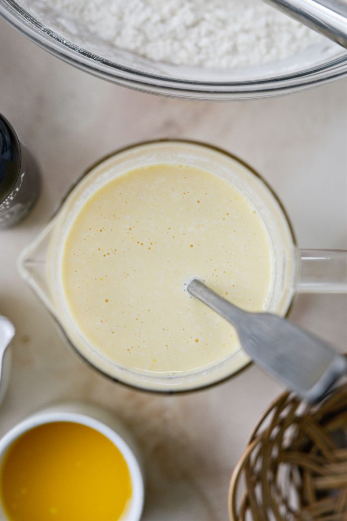 - In a liquid measuring cup, measure the buttermilk and add in the eggs and vanilla. Whisk well until combined.