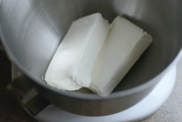 Drop the 2 softened bricks of cream cheese into the bowl of your stand mixer (that’s fitted with the paddle attachment!).
