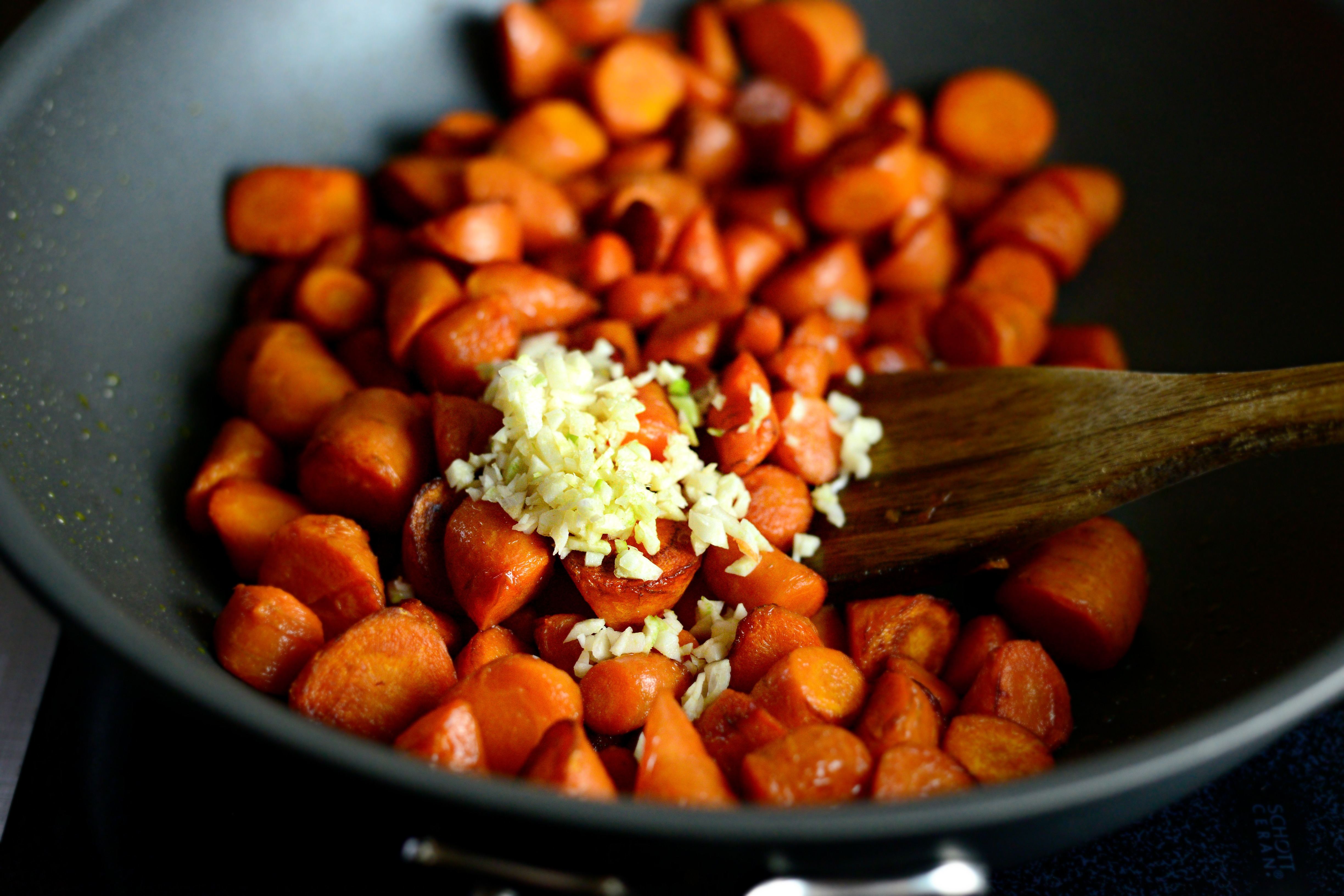 Peel 2 pounds of carrots and then roll cut them and finely mince 2 cloves of garlic.