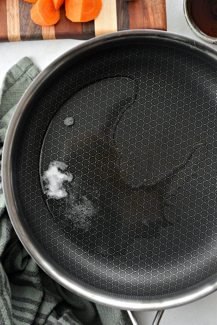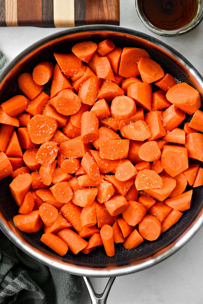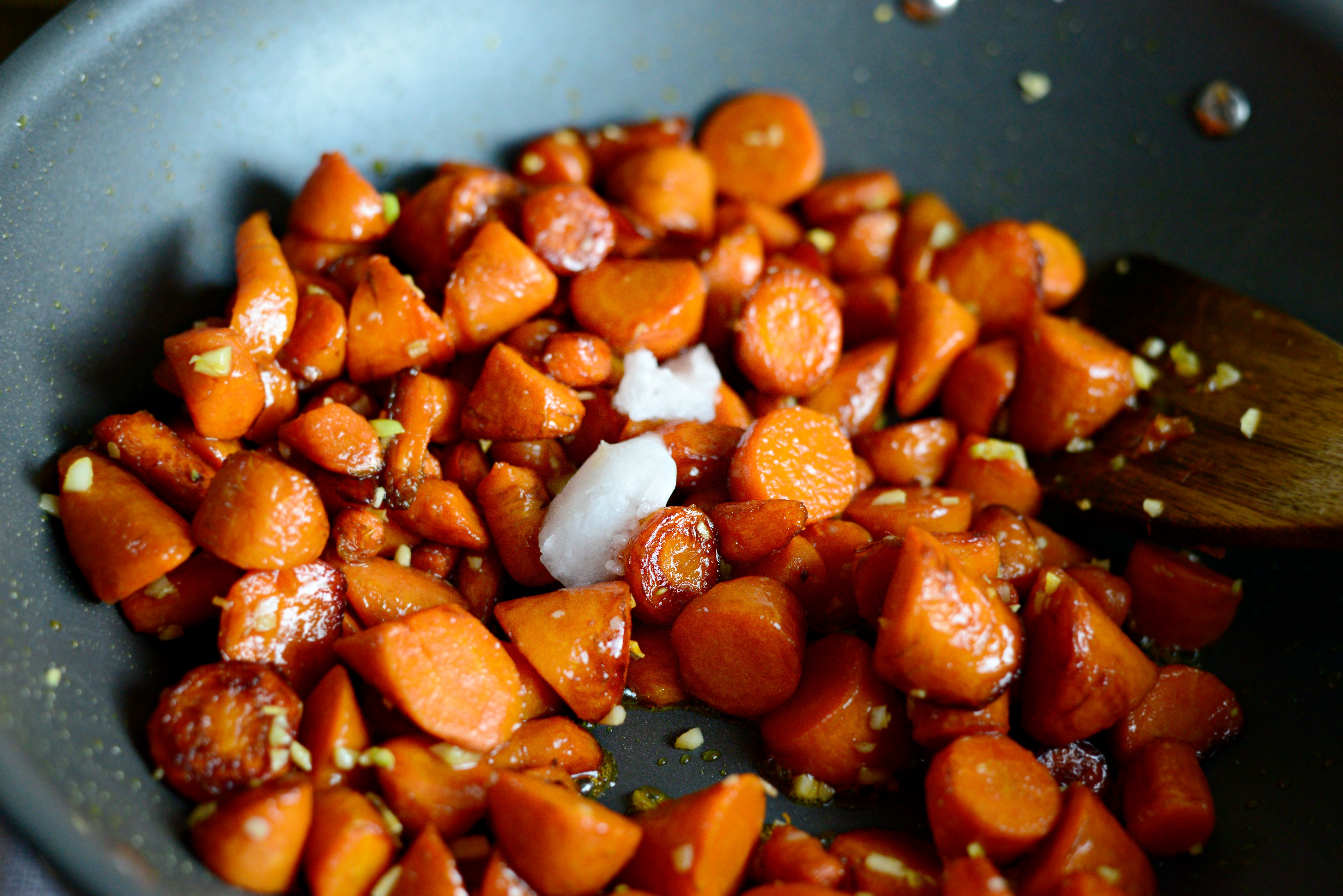 - Heat coconut oil in a large 10 to 12-inch skillet over medium heat. Add carrots and kosher salt. Toss to coat the carrots in the coconut oil and cook the carrots for 20-25 minutes or until tender and the edges of the carrots caramelize. Toss occasionally.