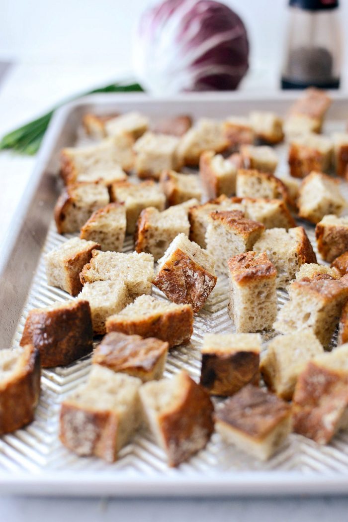 Mean while toss about 8 cups of cubed rye bread onto a rimmed metal baking sheet that’s been sprayed with olive oil. Spray the tops of the rye with move olive oil and bake on the middle rack of your preheated oven for about 8 to 10 minutes or until toasted and golden in spots.