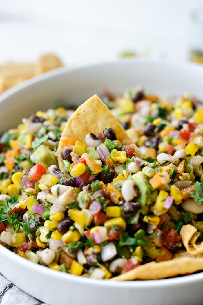 In this recipe, I toss black beans and black eyed peas with charred corn, diced roma tomatoes, sweet bell peppers, jalapeño, red onion, cilantro and avocado with a super simple and flavorful chili lime vinaigrette.