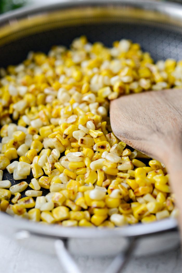 Add 1-3/4 cups sweet corn (thawed if frozen) to a dry skillet and cook over medium heat. Cook, undisturbed for 2 to 3 minutes or until a good char forms. Stir and repeat for another 2 to 3 minutes until charred in spots. Remove off of the heat and let cool.