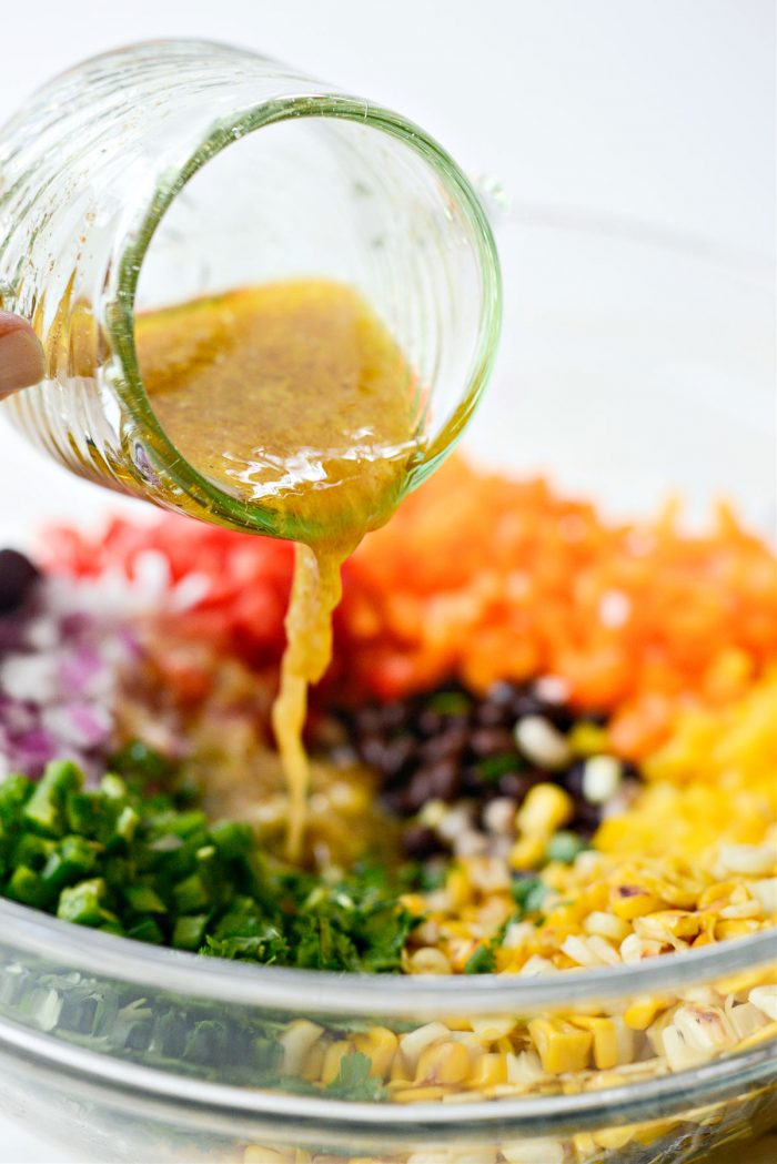 In a large mixing bowl add 1 (15 ounce) can each black beans and black eyed peas (drained and rinsed). Then add in 2 to 3 diced roma tomatoes (seeds removed and discarded), 1 finely diced yellow and orange bell pepper, the (cooled) charred corn, 1/3 cup chopped cilantro, 2 finely diced jalapeños (seeds and ribs removed for less heat) and 1 medium red onion finely diced.