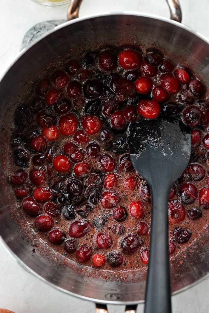 This super simple glaze only calls for 8 basic ingredients and adds a delicious sweet and tangy glaze to your ham. Not to mention the color is stunning as well! It all starts with fresh cranberries that simmer with orange juice, maple syrup and brown sugar until they soften and pop. Then puree with Dijon Mustard, apple cider vinegar, ground clove and cayenne.