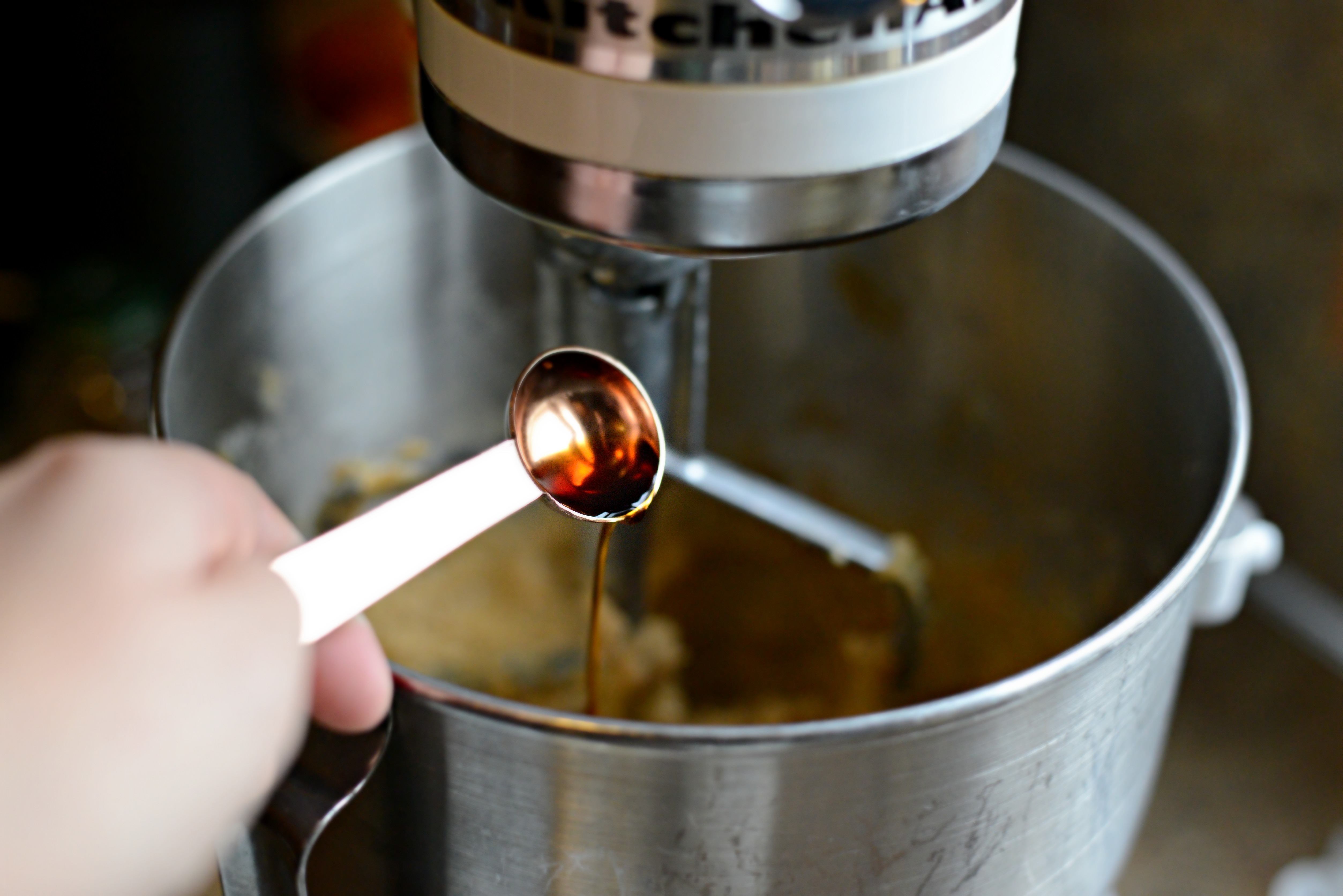 - In the bowl of your stand mixer (fitted with the paddle attachment) cream the butter until light in color, and the sugars and blend until light and fluffy. Add eggs one at a time, mixing after each one. Measure and add in vanilla. Gradually add in the flour mixture, a little at a time. Don't over mix.