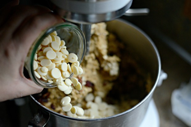 - Mix in oats, cranberries, chopped pecans and white chocolate chips. Use a two tablespoon scoop to measure out cookie dough and place a little over an inch apart onto a prepared baking pan and place on the middle rack in your preheated oven for 10 minutes, rotate the pan halfway through to ensure even baking.