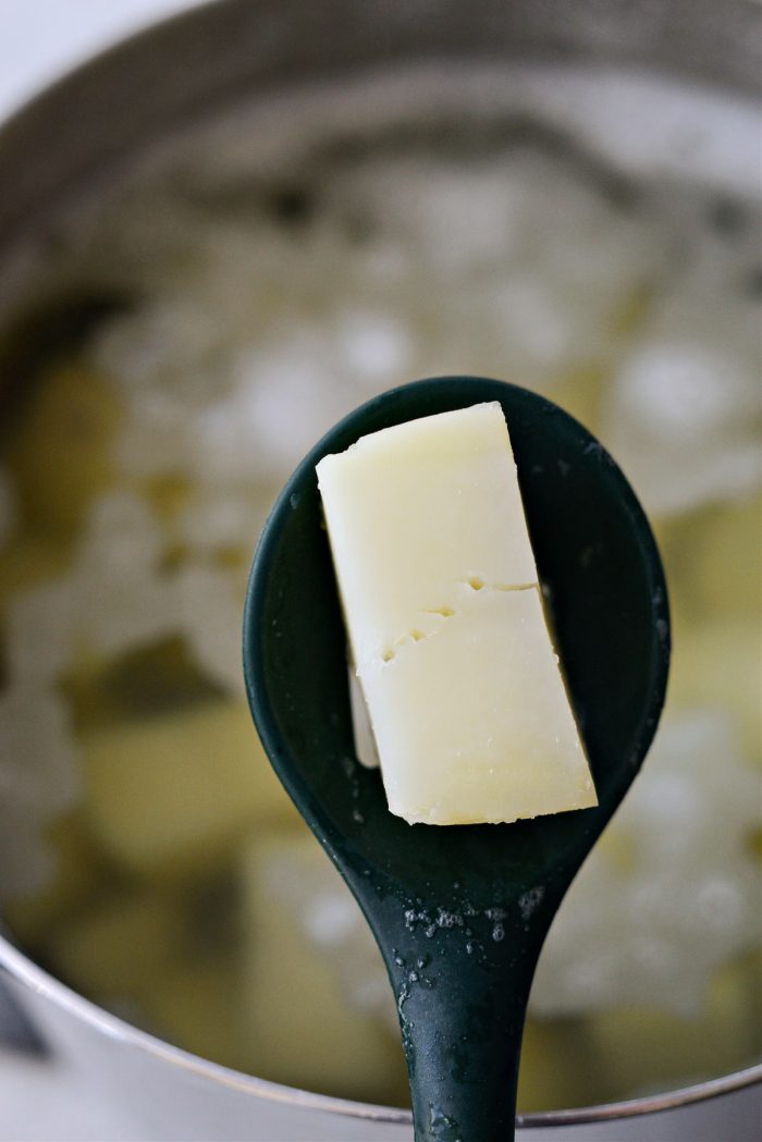 To the riced potatoes, add in 1 stick (8 tablespoons or 1/2 cup) of unsalted butter.