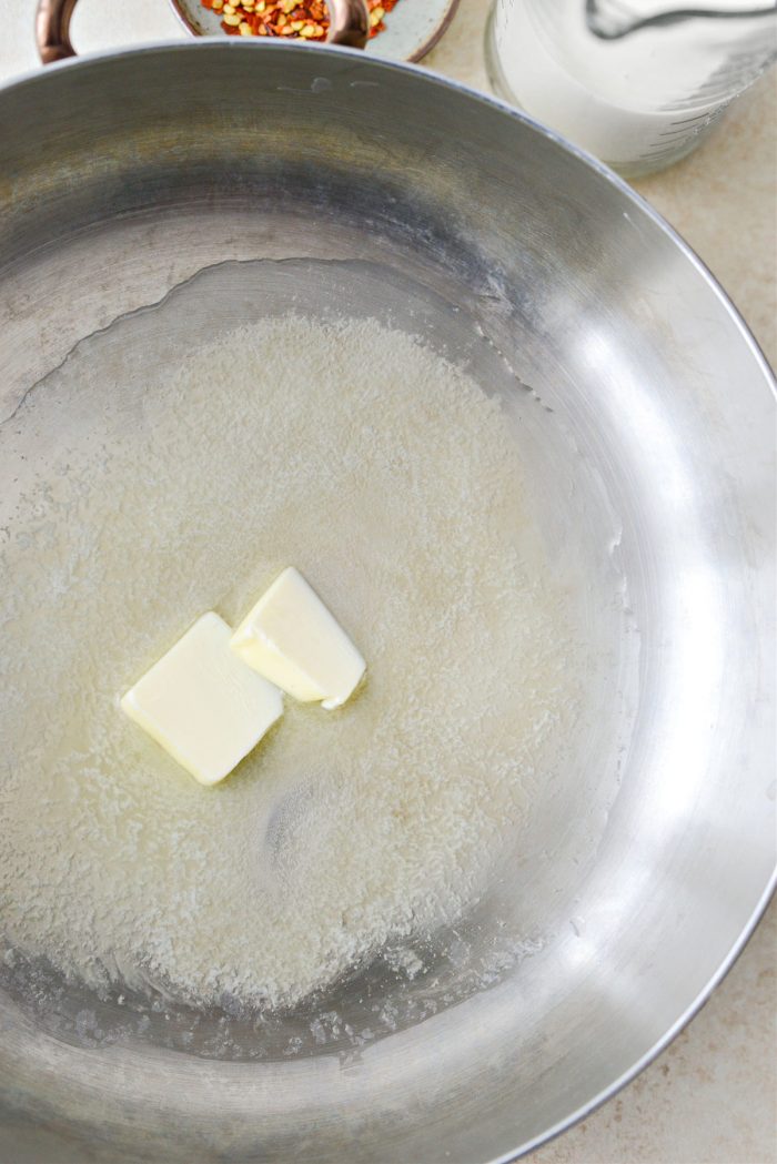 - Meanwhile, in a 10-inch skillet, add olive oil with unsalted butter and heat over medium-low.
