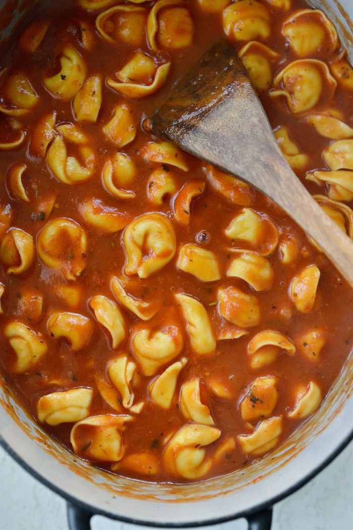 - Cover and bring to a boil, reduce heat to medium-low and add in the tortellini. Cook (uncovered) for 10 to 12 minutes or until tender.