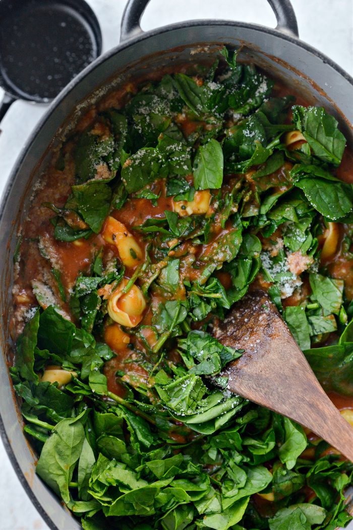 Cover and bring that to a boil, reduce heat to medium-low and add in 20 ounces of cheese filled tortellinis.