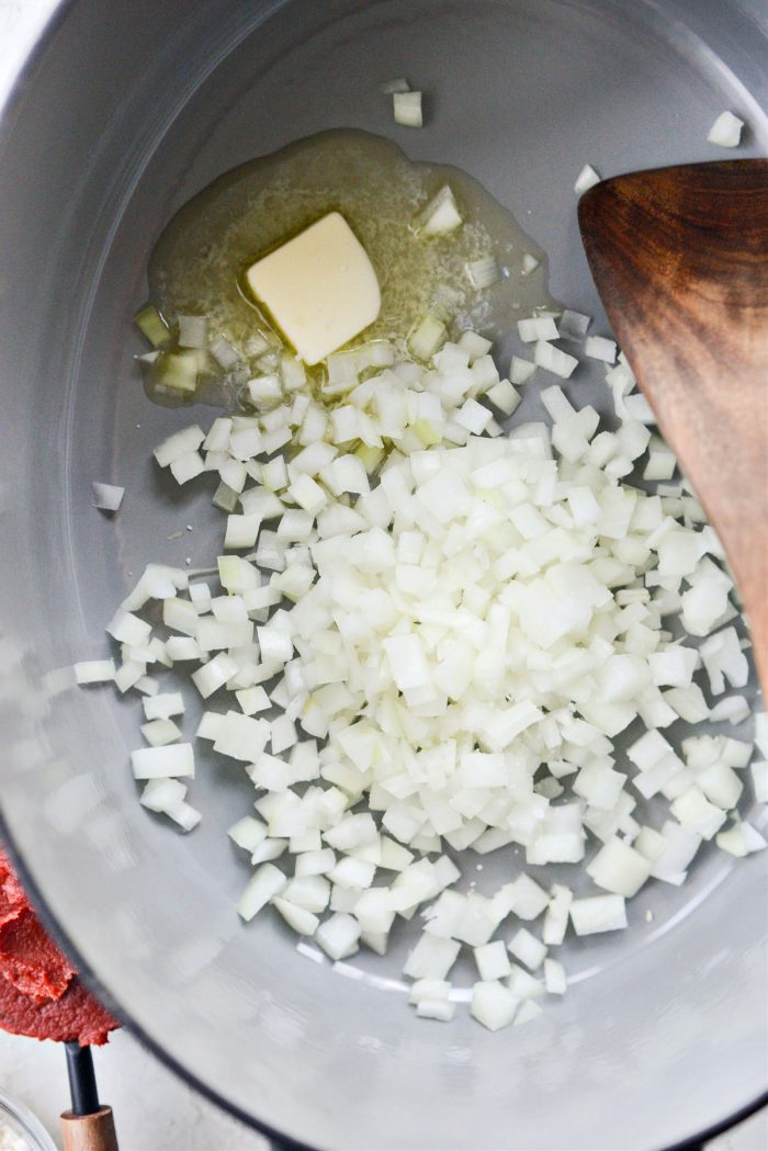 Add 2 tablespoons butter and 1 diced medium yellow to a large dutch oven. Cook over medium-low until soft and translucent.