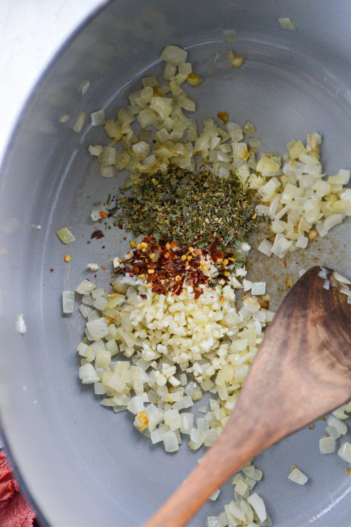 Next add in 1 tablespoon italian seasoning, 1/2 teaspoon red pepper flakes and 4 cloves minced fresh garlic. Stir and cook 1 minute.
