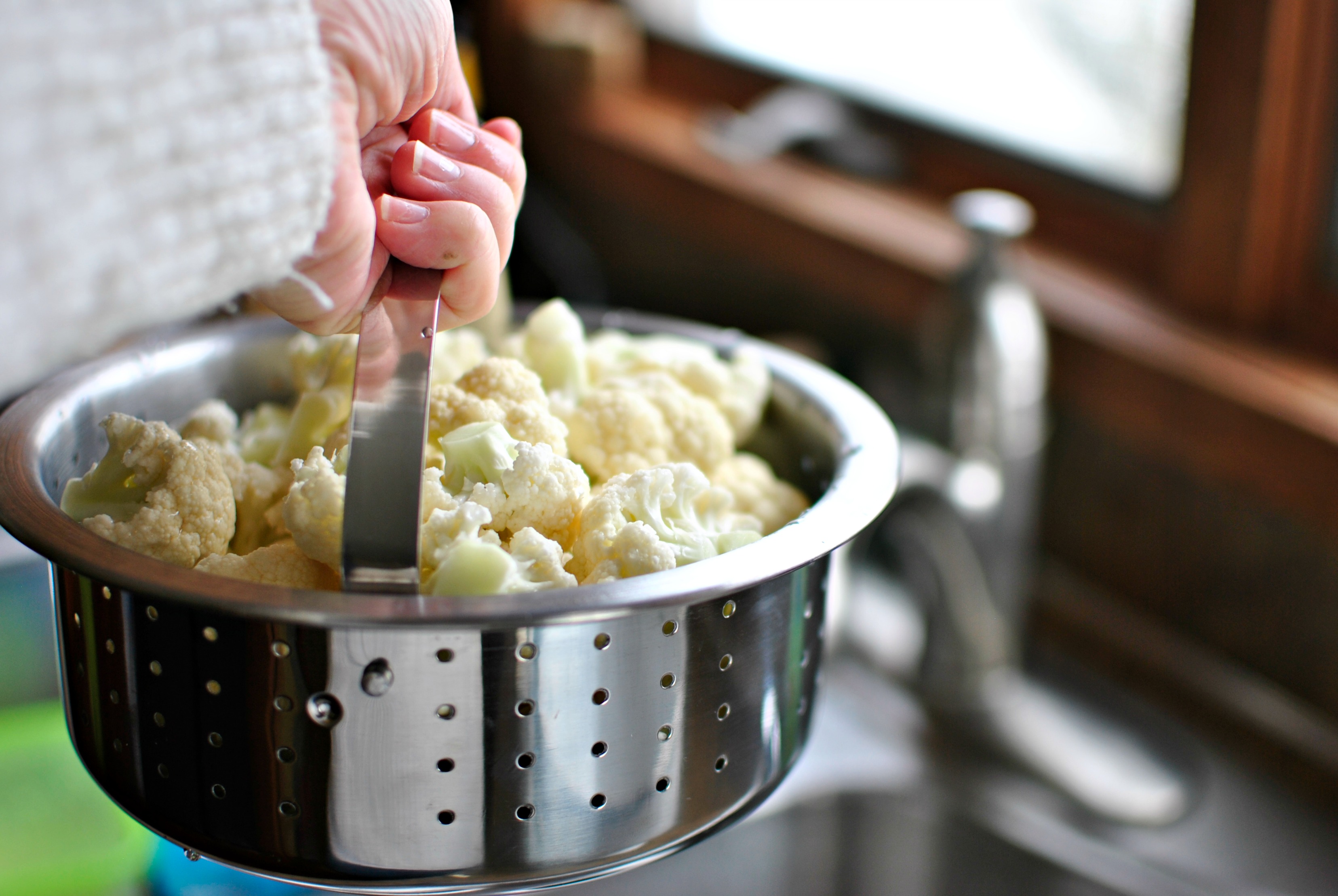 - Place the cauliflower florets into a colander and rinse under cool water.
