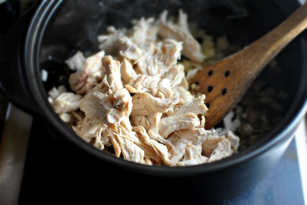 When the chicken is fully cooked, us tongs to remove the chicken and transfer to a cutting board. Use two forks to shred the chicken.