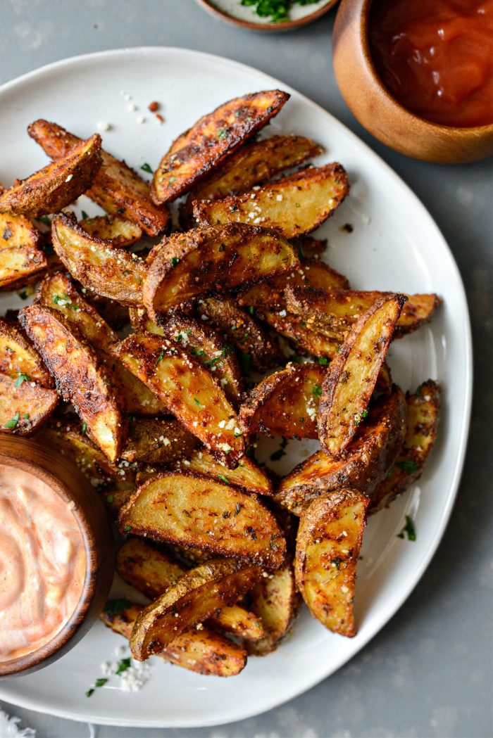 - Before serving, taste a potato wedge and season with salt if needed. Serve the crispy potato wedges with a sprinkle of cheese and minced parsley (if desired) and dip in the fry sauce or use ketchup or ranch!