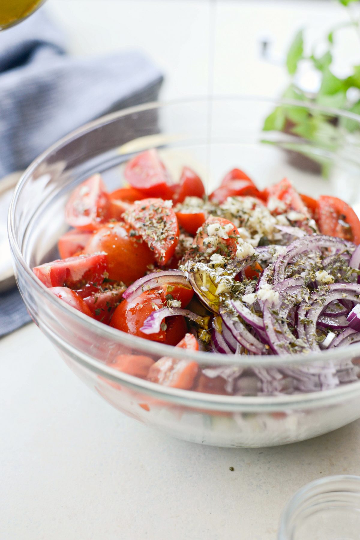 Then quarter 1 pound campari tomatoes, slice 1/2 a medium red onion and finely mince up 1 clove of garlic and add it to the bowl. Next measure 3/4 teaspoon dried parsley and 1/2 teaspoon dried oregano into your palm. Pinch the herbs in-between your fingers and rub together, over and into the bowl.