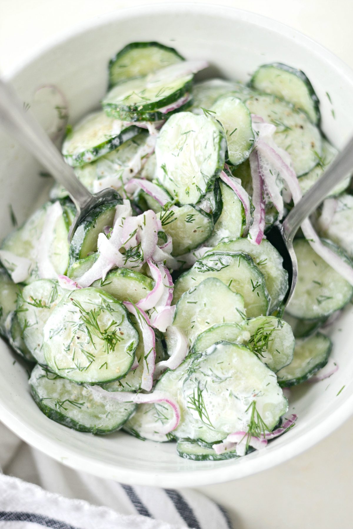 This Cucumber Salad is a recipe that’s been in my family for years. Fresh cucumbers and onions, salted, squeezed and tossed with simple and flavorful sour cream dill dressing. Serves 8 depending.