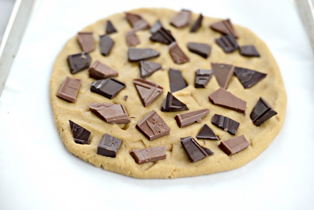 • Turn the dough out onto the prepared pan and shape into 10-inch circle. Press the chunks of chocolate into the cookie and bake on the middle rack of your oven for 20 to 25 minutes or until the middle is set.