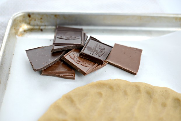 Break the chocolate into misshapen chunks and press them into the top of the cookie.