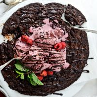 As for serving? Add scoops of your favorite ice cream! We like using a black raspberry dark chocolate chunk but any flavor would be great! Lastly drizzle with chocolate syrup.
