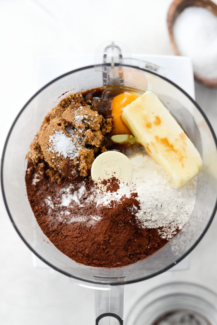 In the bowl of your food processor, measure and add; 6 tablespoons (room temperature) unsalted butter, 1/2 cup each dark brown sugar and granulated sugar, 1 large egg, 1 teaspoon pure vanilla extract, 1 cup unbleached all-purpose, 1/4 cup unsweetened dark cocoa powder (I used Hershey’s Special Dark) and 1/4 teaspoon kosher salt.