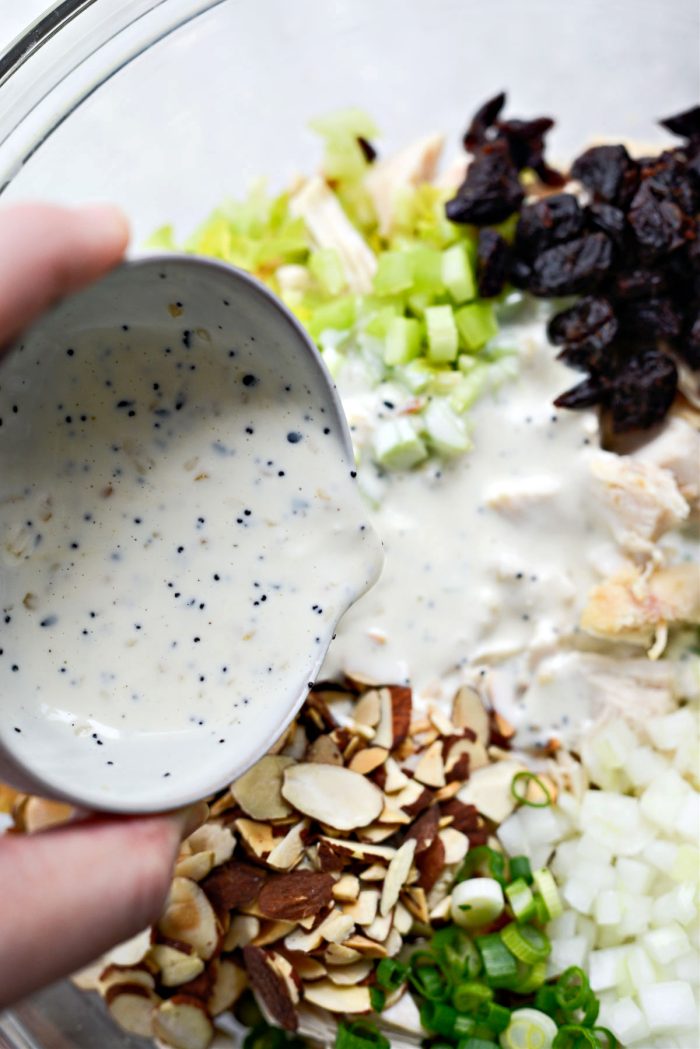 I only had slivered almonds on-hand and toasted them up for a great result. Also, the night before, I oven roasted some bone-in skin-on chicken thighs, removed the skin, and then shredded the meat when cool. I made the dressing the night before too, and when it came time to assemble today, it took no time at all to put the salad together. Love, love it!