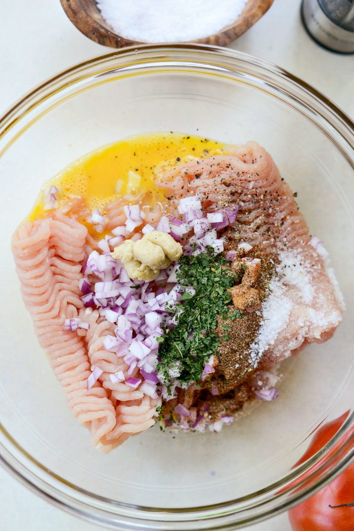 - In a glass mixing bowl, add the turkey, beaten egg, red onion, grated garlic, cajun seasoning, dried parsley, kosher salt and some freshly ground black pepper.