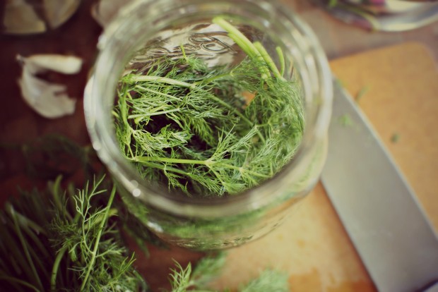- In two large impeccably clean glass jars; divide in the smashed and peeled garlic cloves, bay leafs and stuff with a handful of fresh dill.