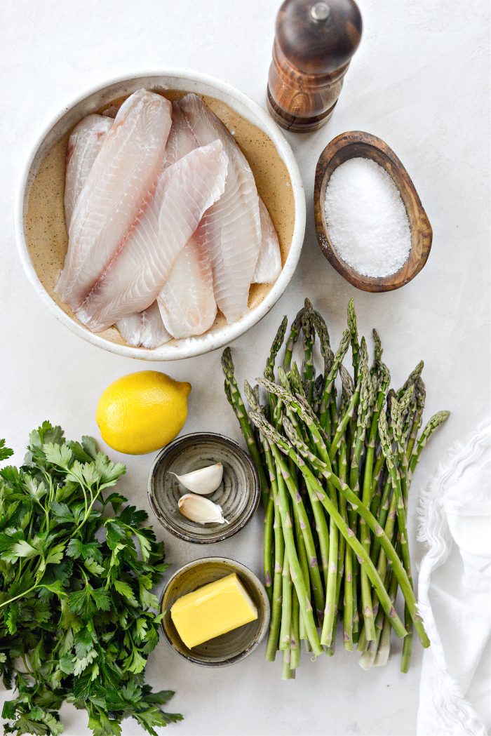 Tilapia filets and fresh asparagus are brushed with a super simple lemony garlic butter and cooks on a single sheet pan. The entire recipe takes under 30 minutes! This healthy and flavorful, protein packed dinner is perfect for busy evenings when you don’t feel like cooking – or doing a boatload of dishes.