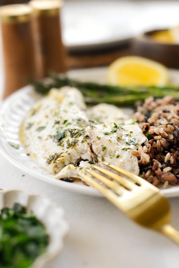 I like to serve this tilapia with wild rice and a wedge of lemon to squeeze over top of everything. I even spoon a little of the pan juices overtop too!