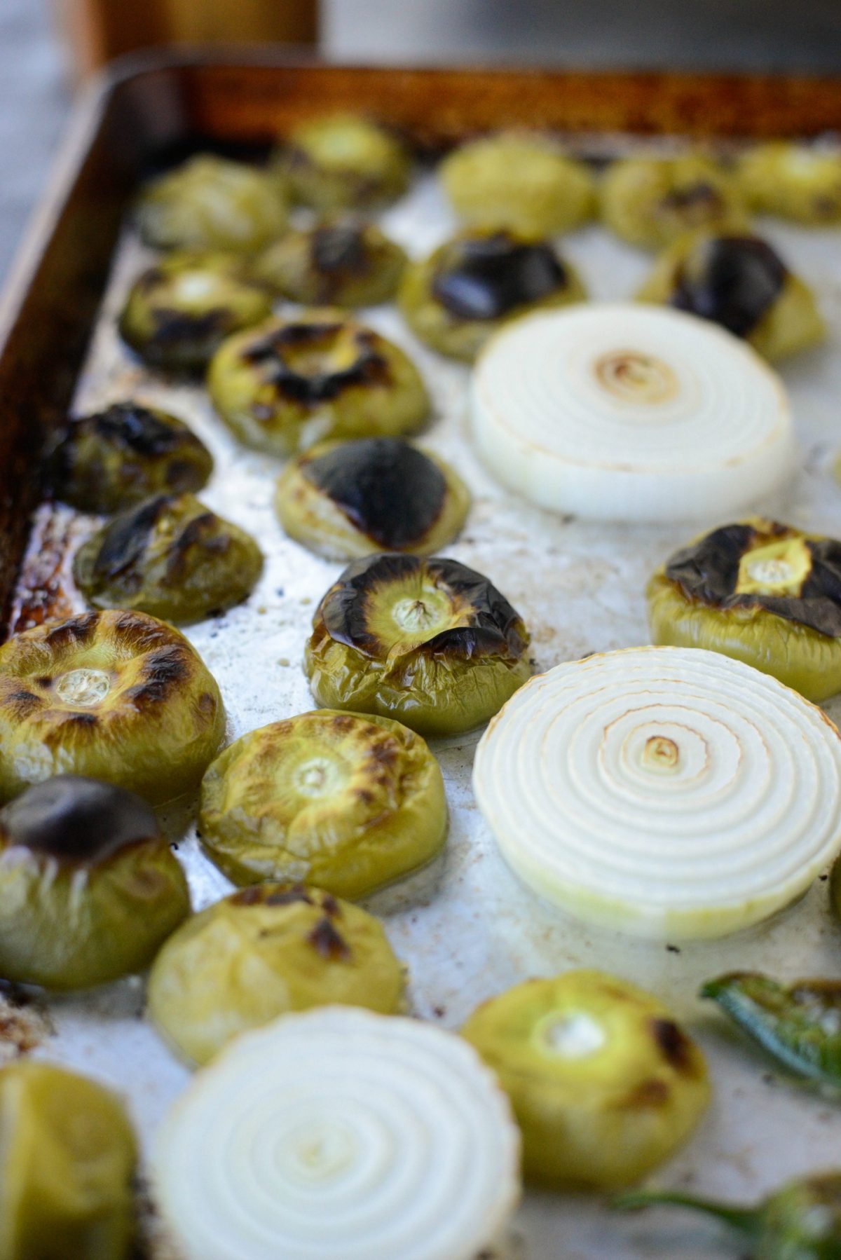 - Place the halved tomatillos and jalapeño (skin side up) onto a rimmed metal sheet pan and arrange the onion slices and the garlic (with the peel still on) onto the pan as well.