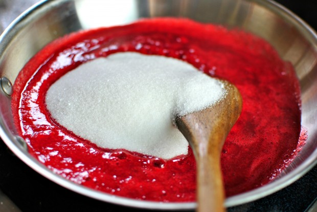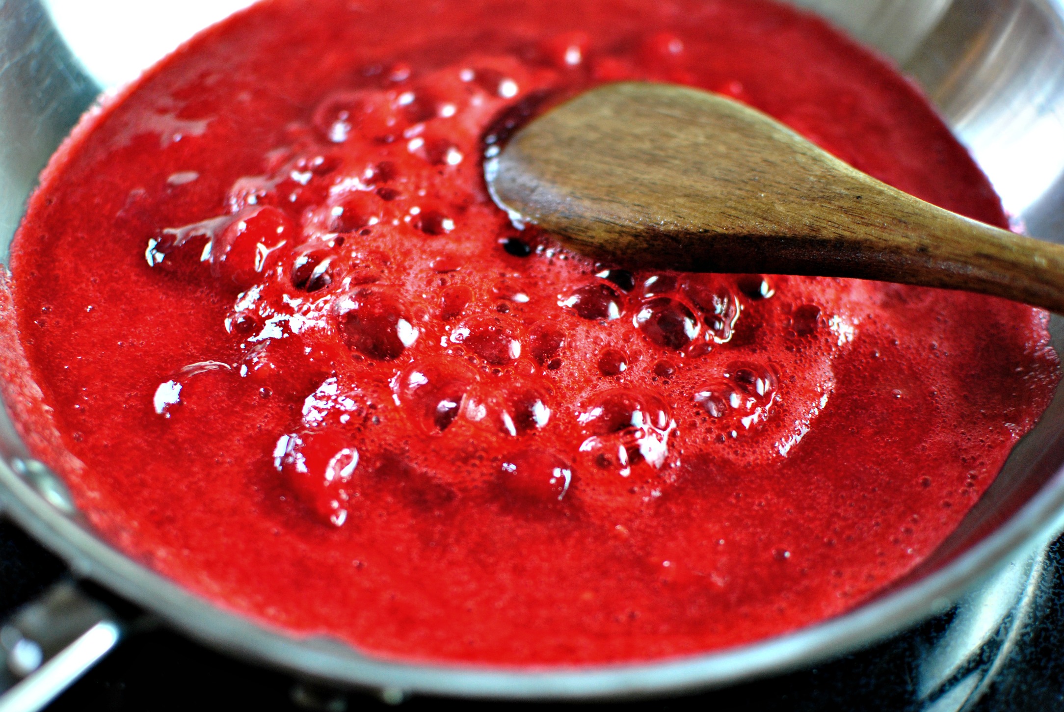 - Bring to a boil and add in the sugar. Stir until dissolved. Bring the raspberry mixture to a boil for one minute, stirring often.