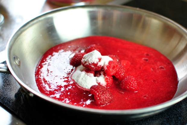 Pour the raspberry puree into a 10 inch skillet and add in the half cup of reserved whole fresh raspberries.