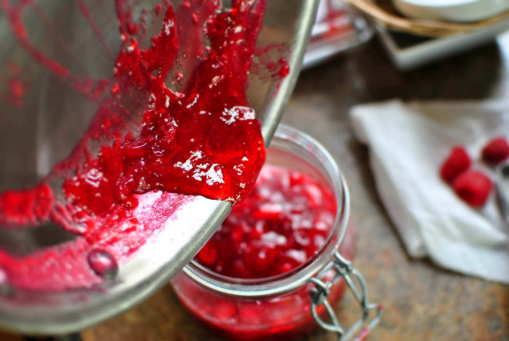 Press and press and press until only the teeny-tiny seeds remain. Don’t forget to scrape the raspberry puree from underneath of the strainer.