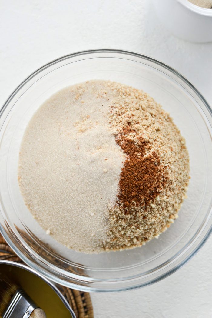 - In a mixing bowl, add cookie crumbs, sugar, nutmeg and mix to combine.