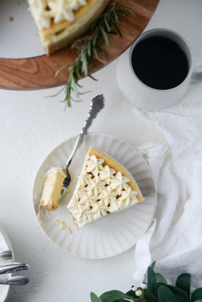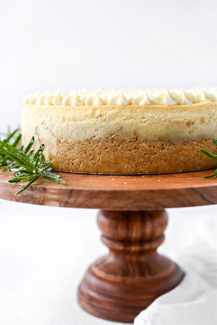 I based this off my New York-style cheesecake recipe and only made a few changes. Because I didn’t want the crust to compete with the flavor of the cheesecake, I used crushed vanilla wafer cookies for the crust instead of graham crackers. And substituted full fat eggnog and heavy cream for the sour cream. Once baked and chilled, I then made an incredible eggnog whipped cream, piped that on top and grated fresh nutmeg over top.