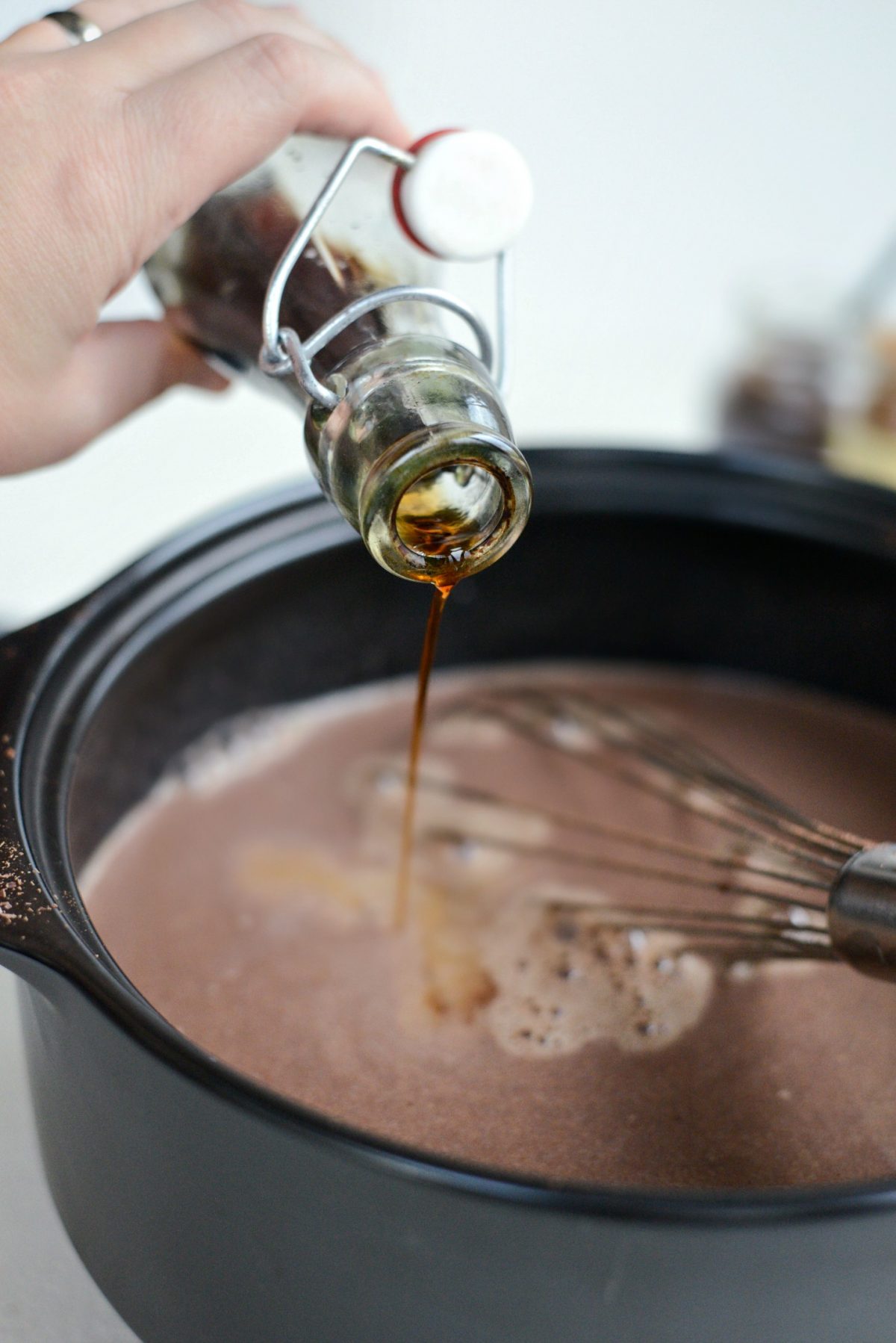 - Once the milk and cream are hot, stir in the sugar and chocolate. Stir until the sugar is dissolved and the chocolate is melted.Then add in the espresso mixture and vanilla.