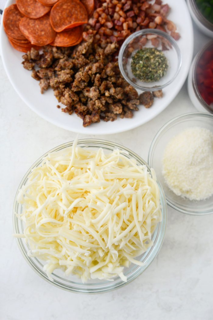 Whether you make your own pizza sauce or purchase it from the store, it’s totally up to you. I make my own in advance, however either way you will need 1/2 cup – give or take to your liking.