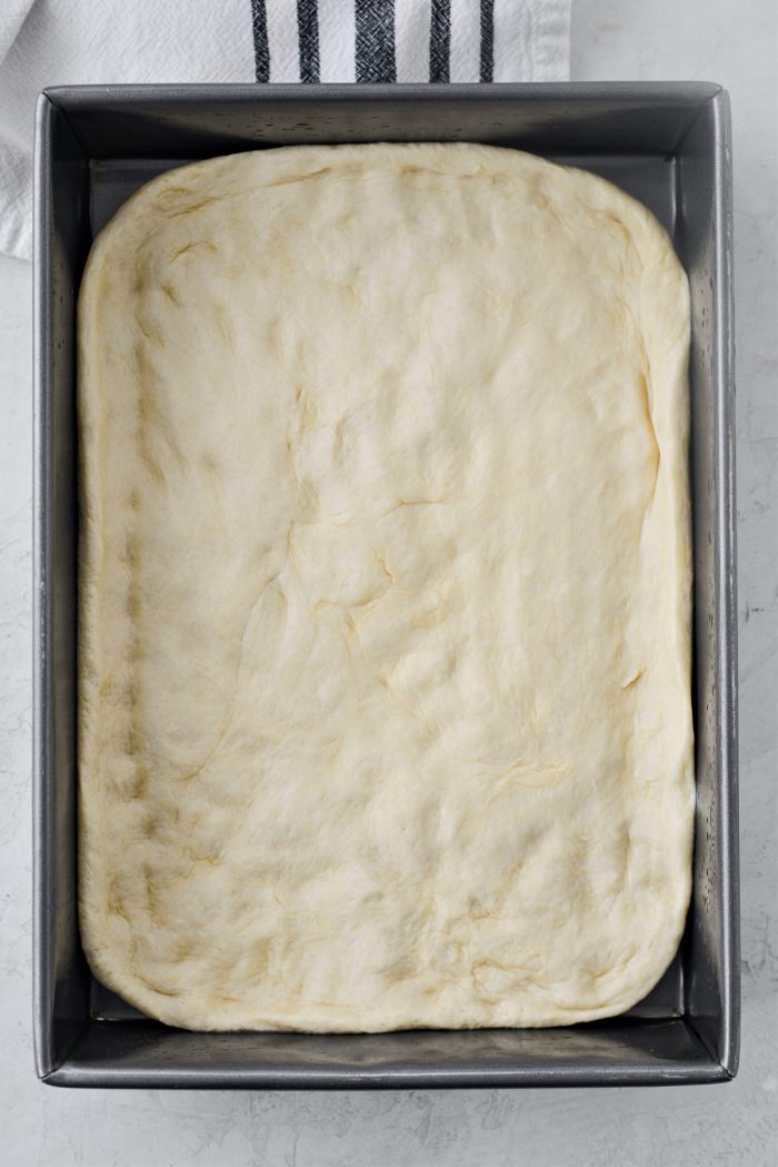 - Transfer the dough to a well oiled 9×13 pan. I add a generous amount of oil beforehand and use a pastry brush to coat the entire inside of the pan.