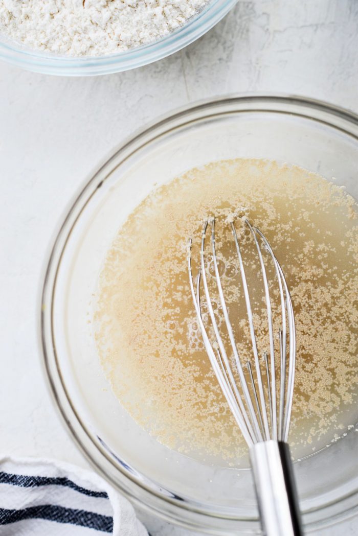 - Add to a medium mixing bowl, pour 1 cup warm/hot water (roughly 115°) and whisk until the honey dissolves. Then whisk in active dry yeast and set off to the side for about 5 minutes.