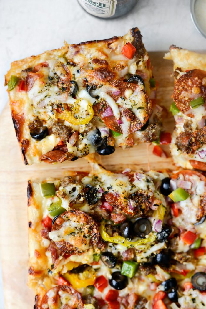 Around this time last year, I had an epiphany. I wondered what it would be like to putt pizza toppings on focaccia. Focaccia is pretty similar to pizza dough, maybe more loftier and softer, but that’s my opinion. And so I started testing recipes. A simple pepperoni (fabulous), one with different meats (do I even need to comment?😍) and of course, a supreme pizza. All of which turned out exceptional. Being that this deep-dish pizza is similar to a Detroit-style, we enjoyed all of them.