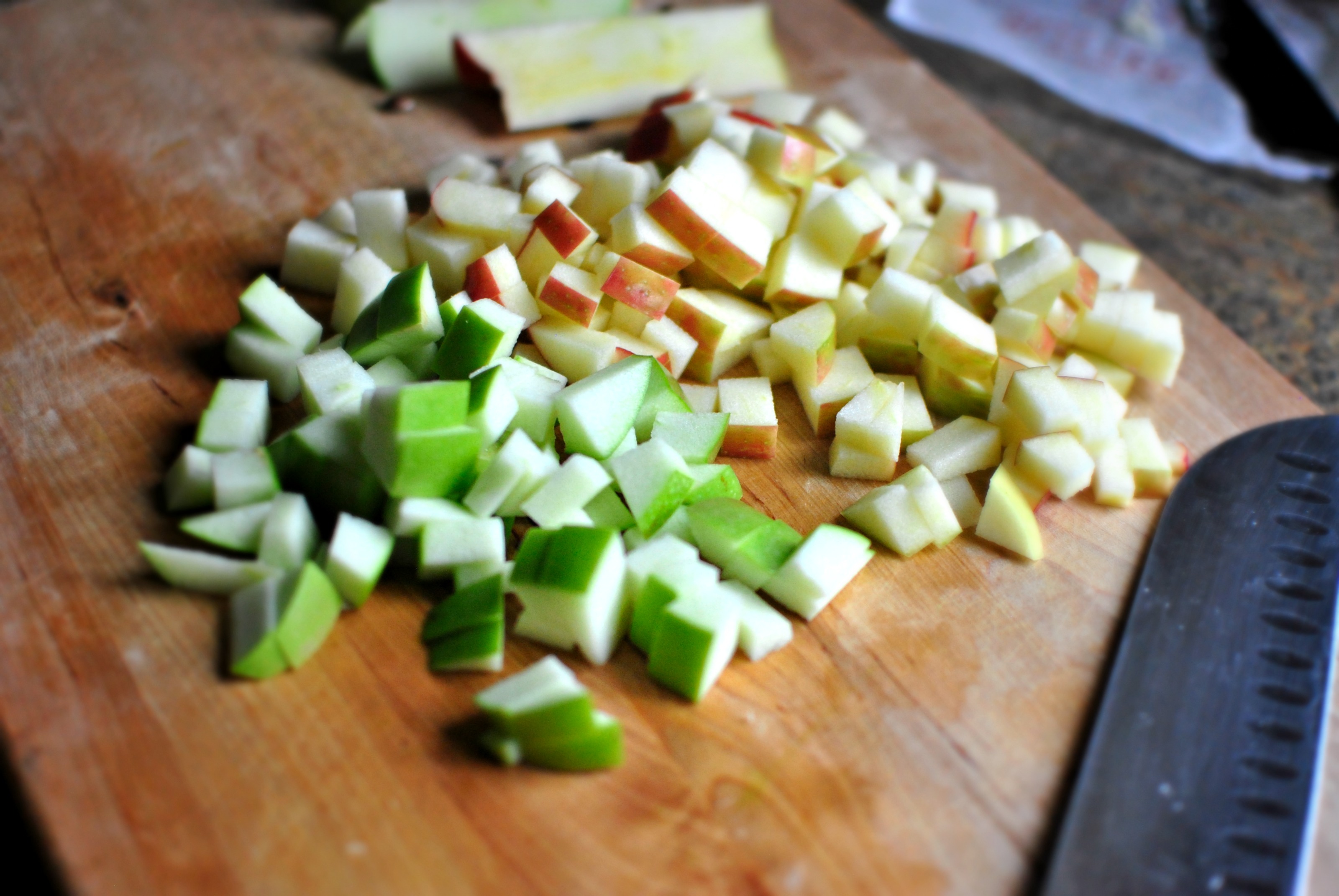 Dice up 1 small granny smith and half of and 1 small honeycrisp apple.