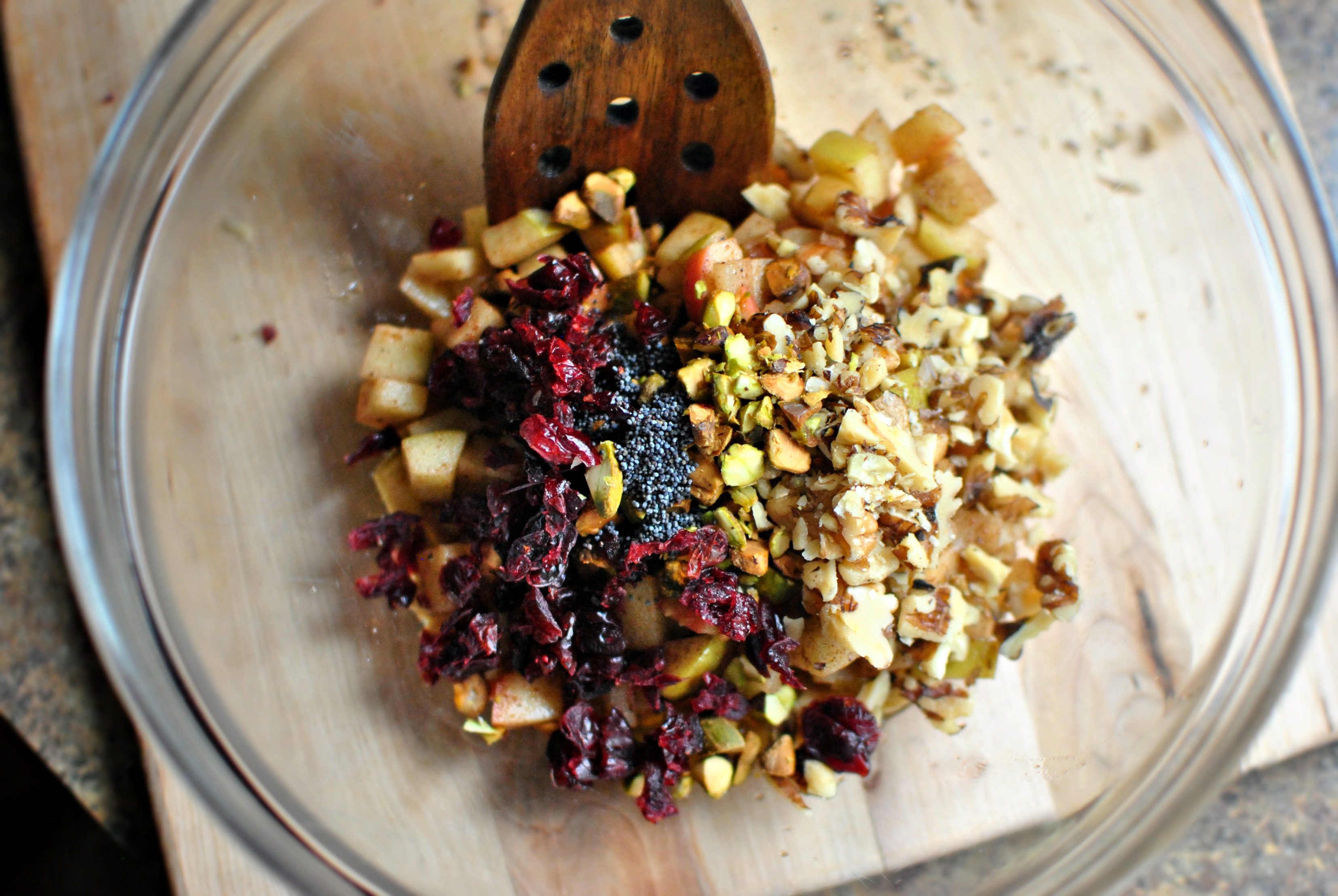 - Remove stuffing mixture to a medium-sized bowl and add in the chopped walnuts, pistachios and cranberries. Measure and add in the vanilla extract and poppy seeds, toss together until well combined.