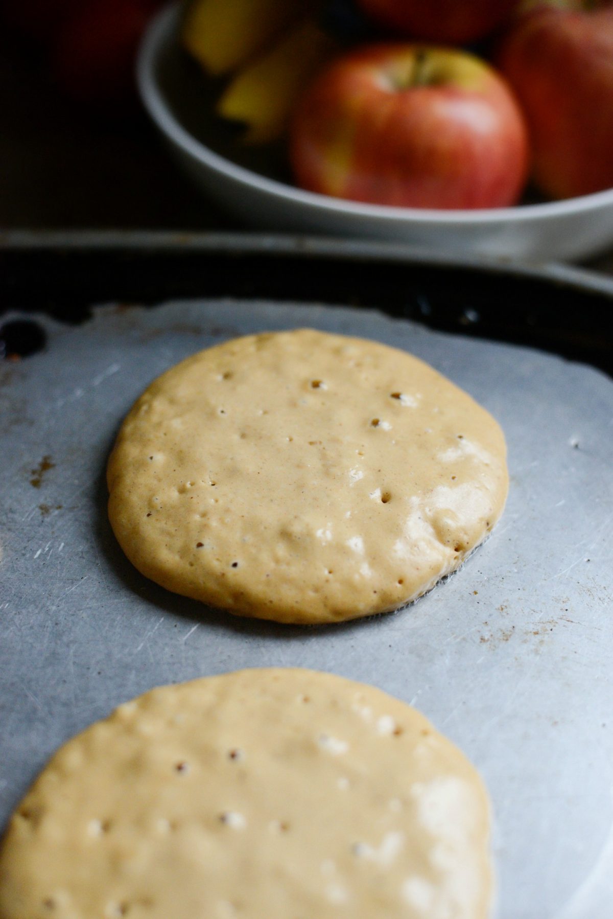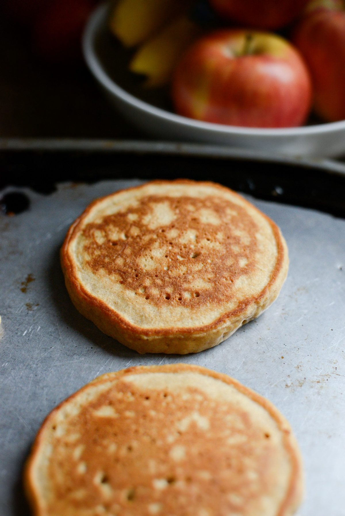 Flip and continue to cook until golden. Place the pancakes on a rimmed, metal baking sheet and keep warm in a 200℉ (or 95℃) oven.
