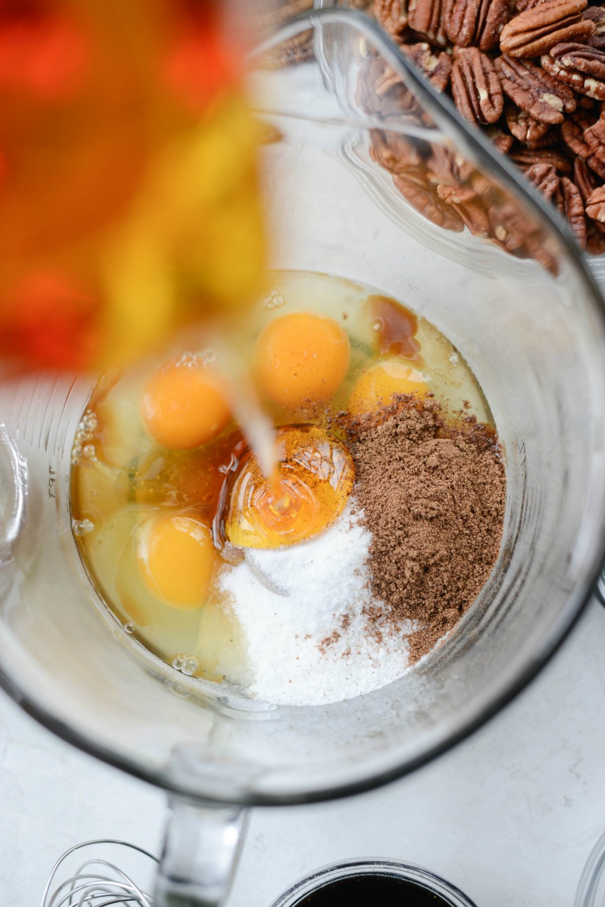 Earlier I rolled out the pastry dough to fit a quarter sheet pan (dimensions in the printable recipe) and then chilled it while I made the filling. To that, add the chopped 3 cups pecans. I chop 2/3 of the nuts while leaving the rest whole.