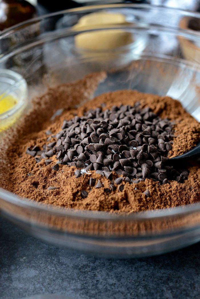 - In a large mixing bowl, sift the flour, cocoa, espresso and baking soda. Then add in the brown sugar, mini chocolate chips and kosher salt. Stir to combine and set aside.